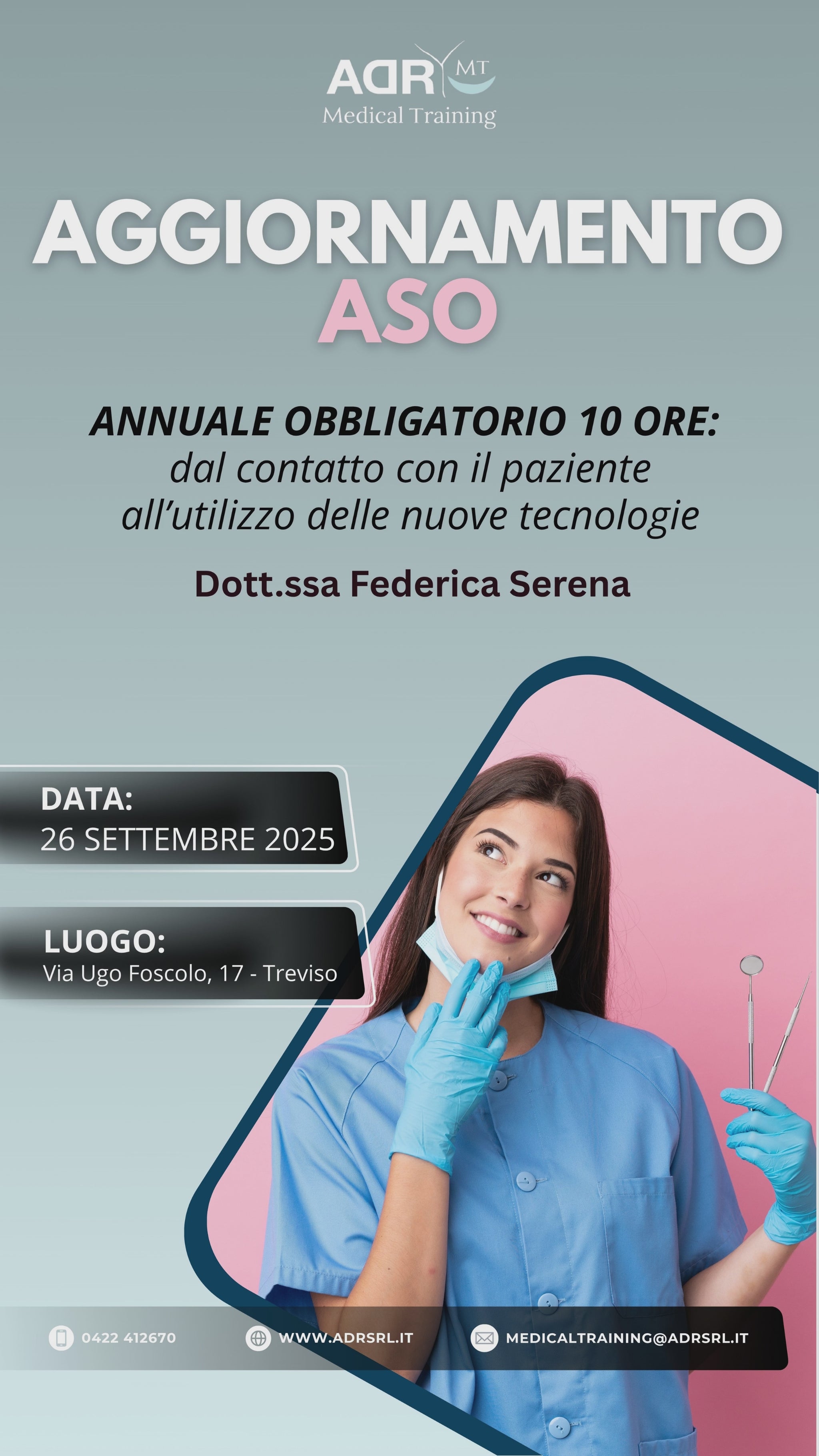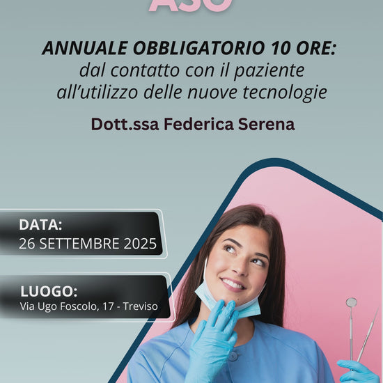 IL CORSO DI AGGIORNAMENTO ANNUALE PER ASO ASSOLVE ALL'OBBLIGO FORMATIVO INDIVIDUATO PER LA FIGURA PROFESSIONALE DI ASSISTENTE DI STUDIO ODONTOIATRICO. Il corso è stato pensato e costruito per dare spunti di riflessione e suggerimenti per affrontare la vita quotidiana negli studi odontoiatrici. La digitalizzazione degli studi, che ha permesso un miglioramento sulla pianificazione clinica, sui flussi di gestione e controllo degli studi ottimizzando le tempistiche generali, deve andare di pari passo con la componente umana e comunicativa che rimane il punto di partenza per creare un rapporto di fiducia con il paziente e ai fini dell’efficacia del percorso terapeutico.